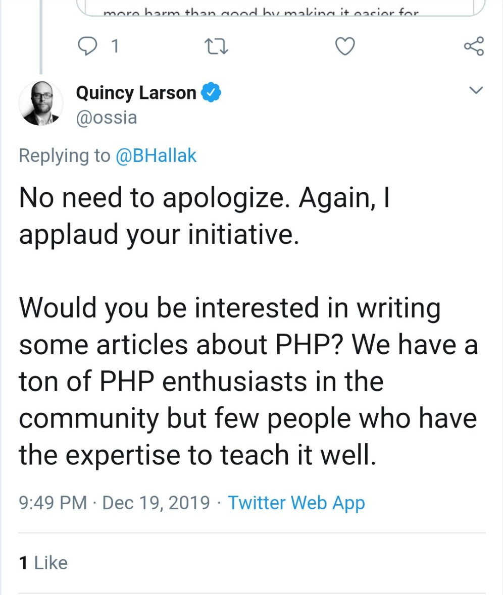 So anyway, back to the Twitter conversation, his interest in PHP articles intrigued me, so I sent Quincy a DM, and we got to chatting about it.