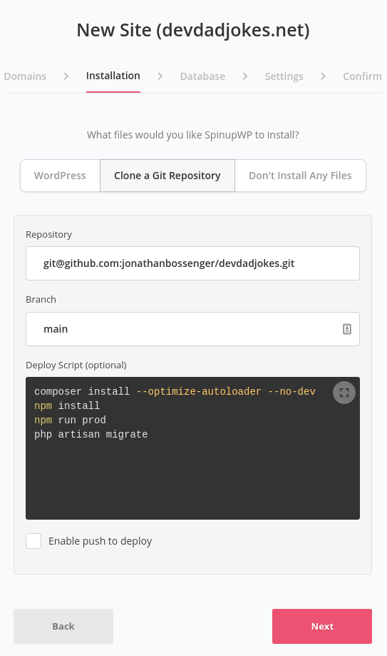 Next up, I created a new site on one of my SpinupWP managed servers. Instead of choosing the WordPress install option, I went with the “Clone a Git Repository” option. I entered my Git repo URL, branch name, and any build commands I needed for the Laravel app.