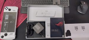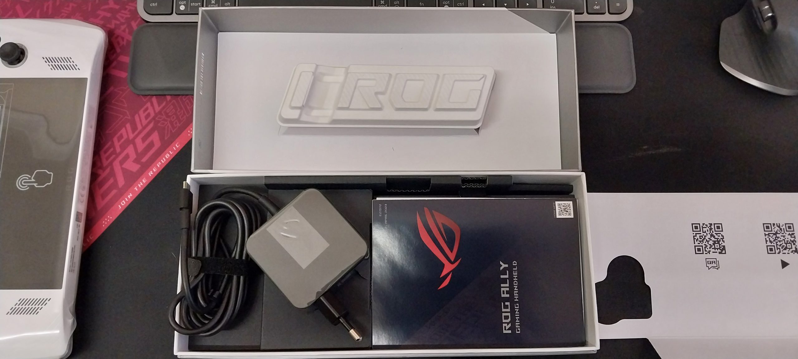 Inside the box, you get the ROG Ally front and center, a charger, a warranty book, a quick start guide, and the ROG Ally branded cardboard stand. I was hoping it would come with a case, but sadly that’s not the … case.