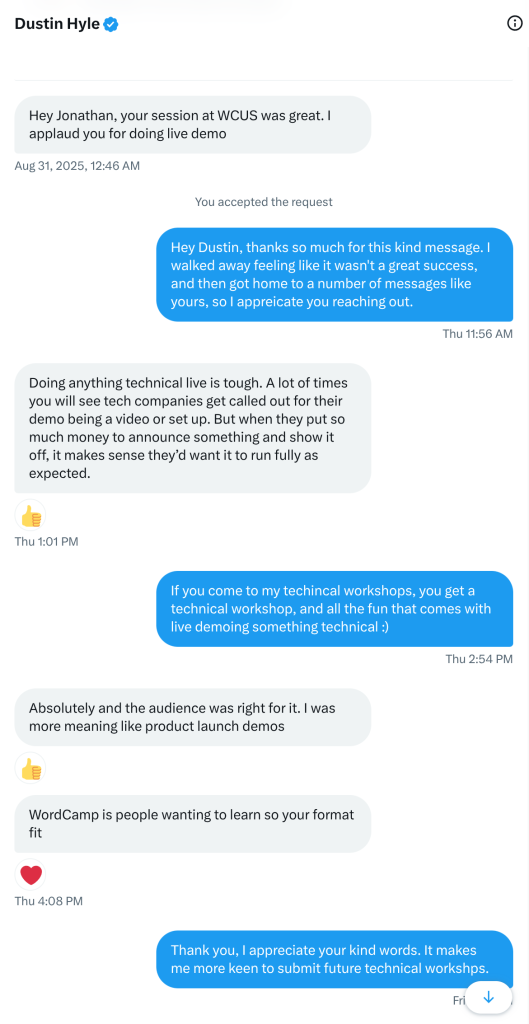 I found the meeting with the YouTubers interesting, as they were (as Nick pointed out later) asking questions that anyone who follows Core updates would know. It made me realise there’s more work to be done around surfacing news and updates to WordPress Core and the project in general to the regular user base. One thing I’ve wanted to do is grow my own YouTube channel and include more content on WordPress Core news and updates. This meeting inspired me to kick off more efforts in this area, especially as I’m part of the 6.9 release squad.